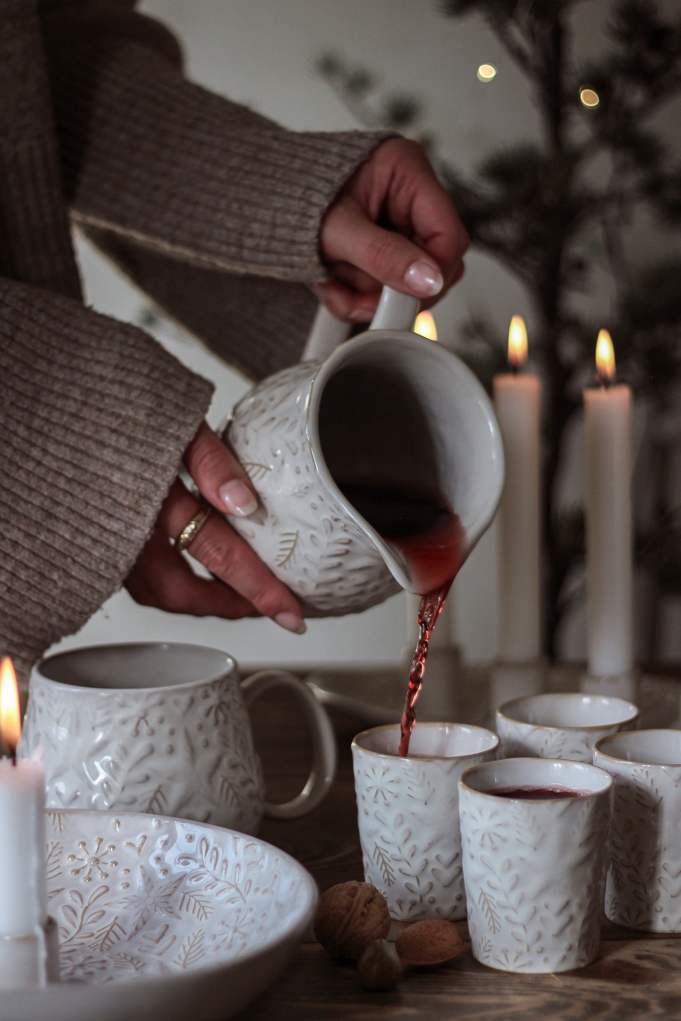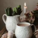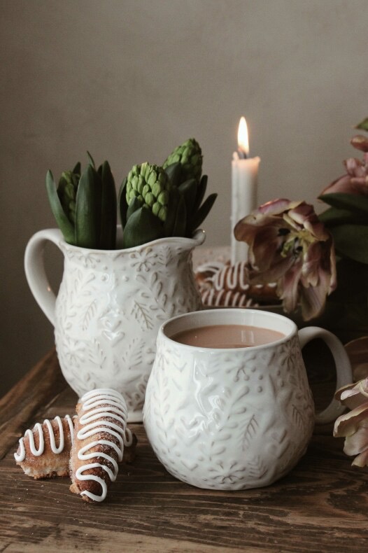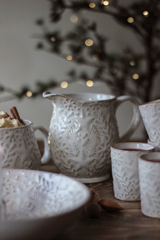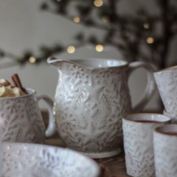 Mysig kanna med vackert juligt mönster av kvistar, hjärtan, stjärnor & snöflingor. Tillverkad av naturvit keramik med en reaktiv glasyr som ger en naturlig & rustik känsla. Passar bra både till glögg, te eller varm choklad. Det finns även muggar & glöggmuggar i samma mönster.