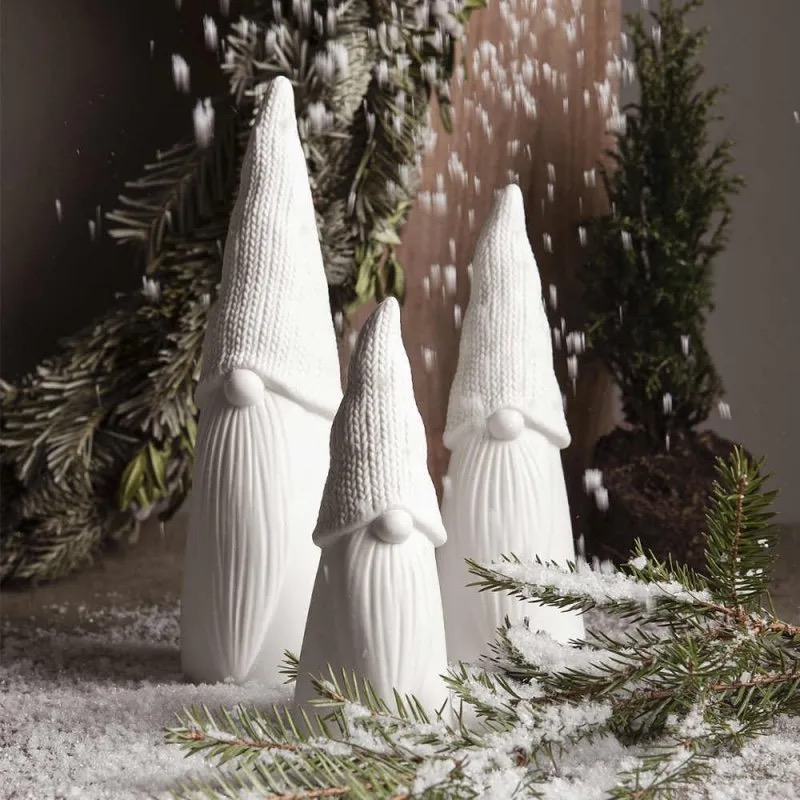Tomten Kurt finns i tre olika storlekar, och denna är den mellersta. Fantastiskt fin vit keramik med stickat mönster i luvan.